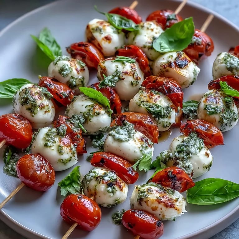 Save This appetizer is as versatile as it is delicious, making it ideal for picnics, parties, or simply a light snack. With the bright pesto tying the skewers together, each bite bursts with herbal freshness and creamy texture.