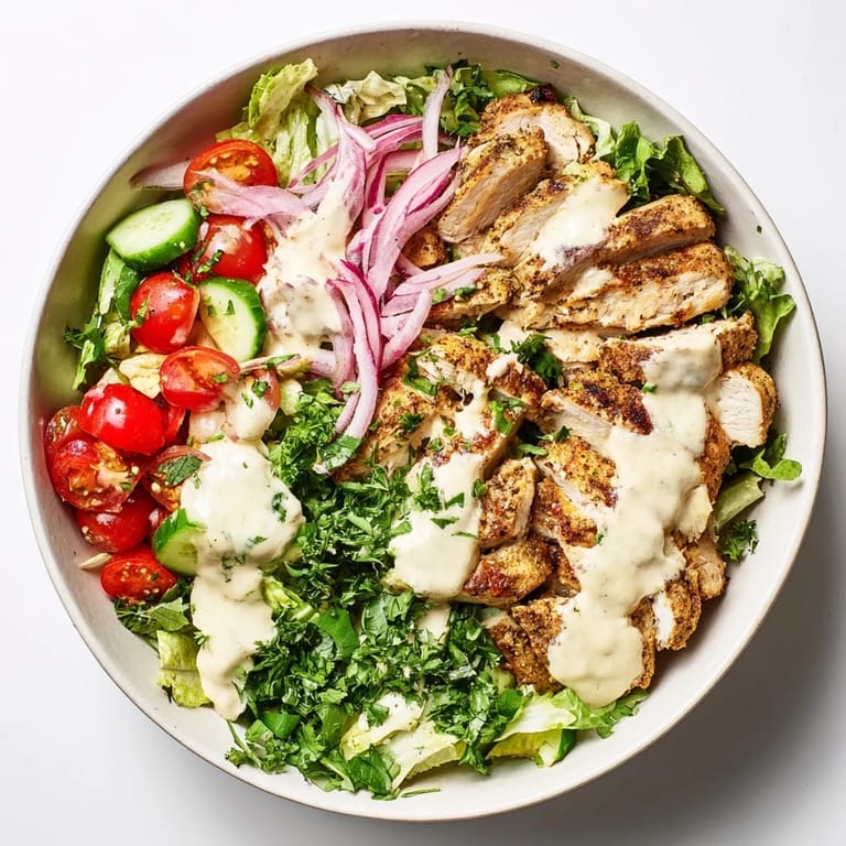 The magic of this bowl lives in the contrast between the warm, heavily spiced chicken and the cool, crisp vegetables underneath. That garlic sauce is the bridge that ties it all together—rich enough to feel indulgent but fresh enough that you dont feel weighed down afterward.