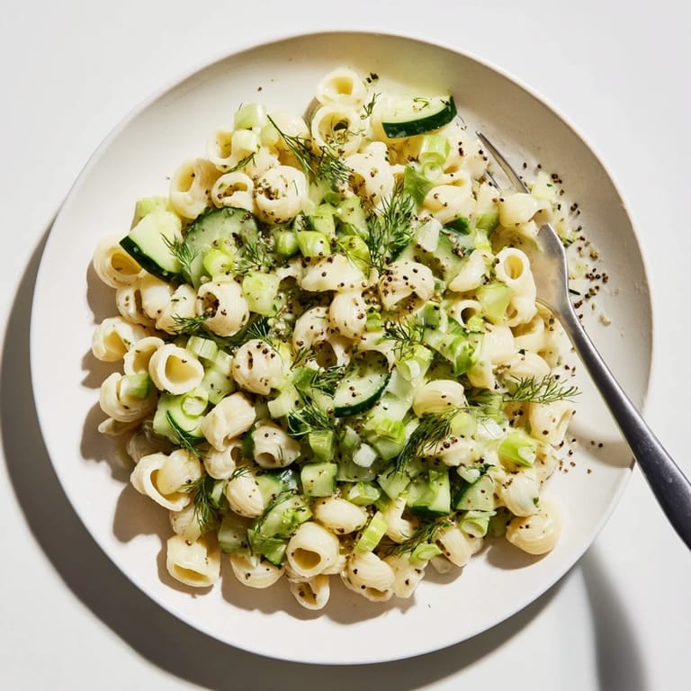- Pour the cooled pasta into the bowl with the cucumber green onions and dill. Add the dressing and gently fold until every shell is covered in that creamy goodness.