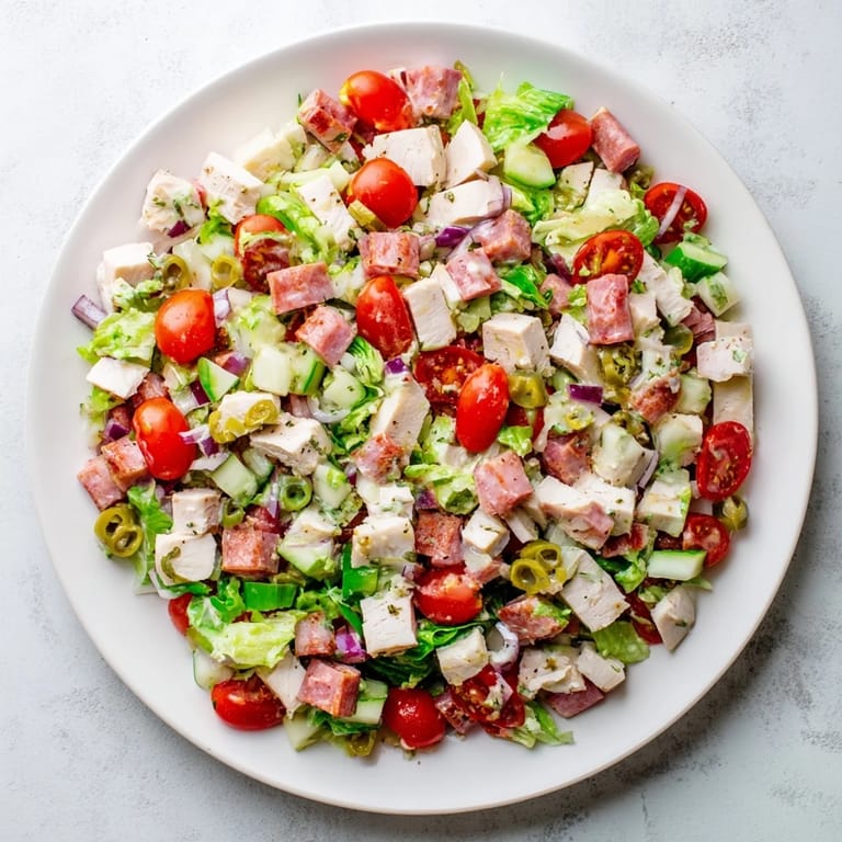 Save This vibrant Italian Deli Chopped Chicken Salad is a hearty and flavorful dish inspired by classic Mediterranean deli staples. Featuring a protein-packed combination of chopped chicken and savory salami, balanced by crisp romaine lettuce and tangy pepperoncini, it is all brought together with a zesty, herb-infused dressing.