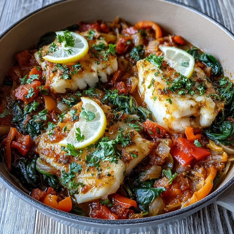 Save My neighbor knocked on my door one Tuesday evening holding a bag of cod fillets she couldn't use before leaving town. I had peppers going soft in the crisper and a half-used can of tomatoes in the fridge. What started as kitchen scraps turned into this beautifully fragrant one-pot meal that filled my apartment with the smell of cumin and paprika. I ate it standing at the stove, mopping up sauce with bread, and knew I'd stumbled onto something worth keeping.